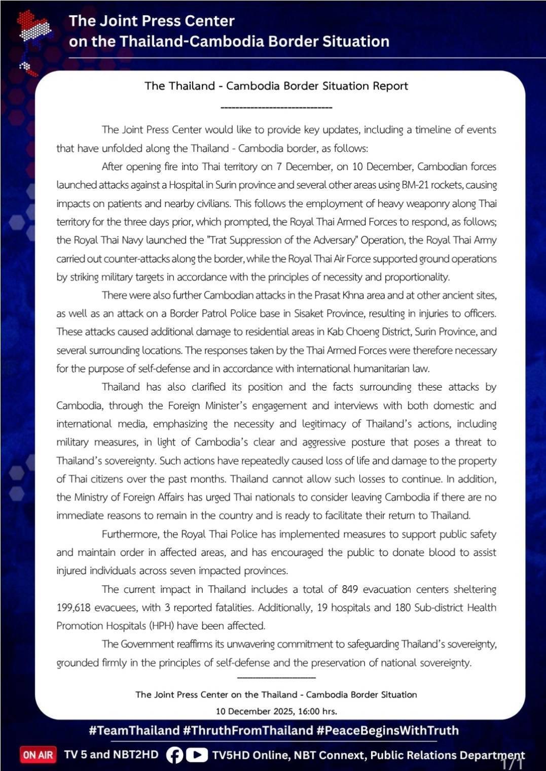 Thailand-Cambodia Border Situation Report, 10 dec 2025, 16.00 hr