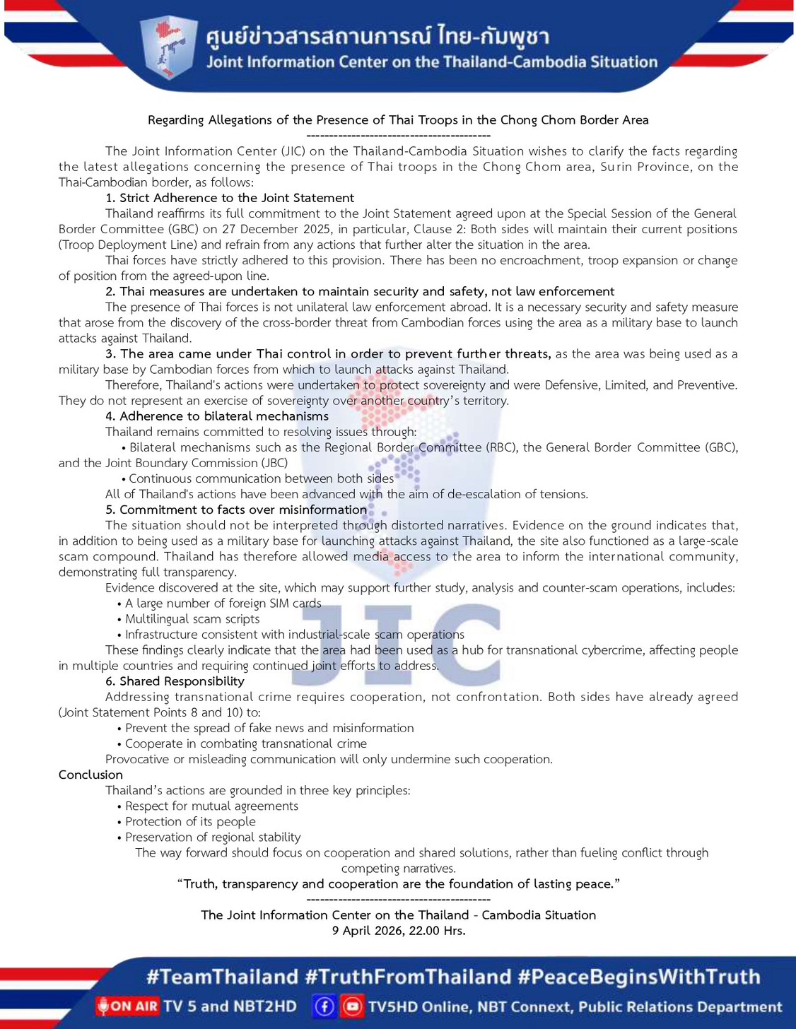 The Joint Information Center (JIC) on the Thailand-Cambodia Situation wishes to clarify the facts regarding the latest allegations concerning the presence of Thai troops in the Chong Chom area, Surin Province, on the