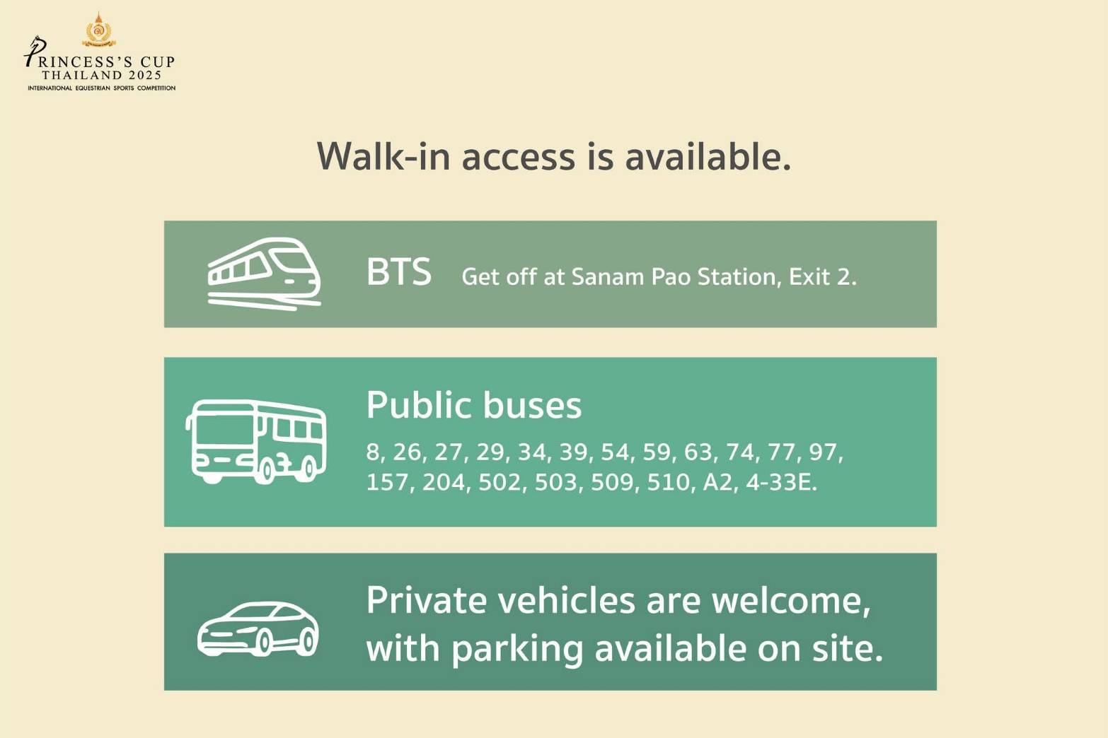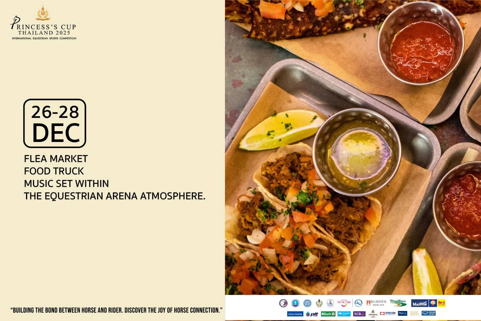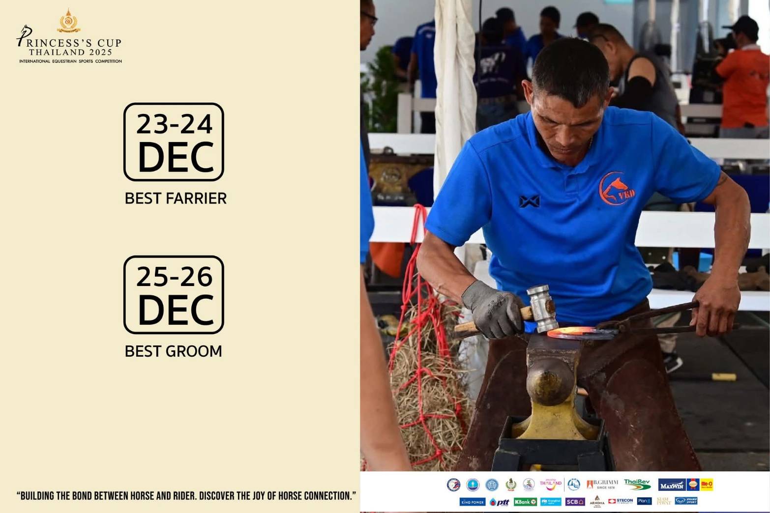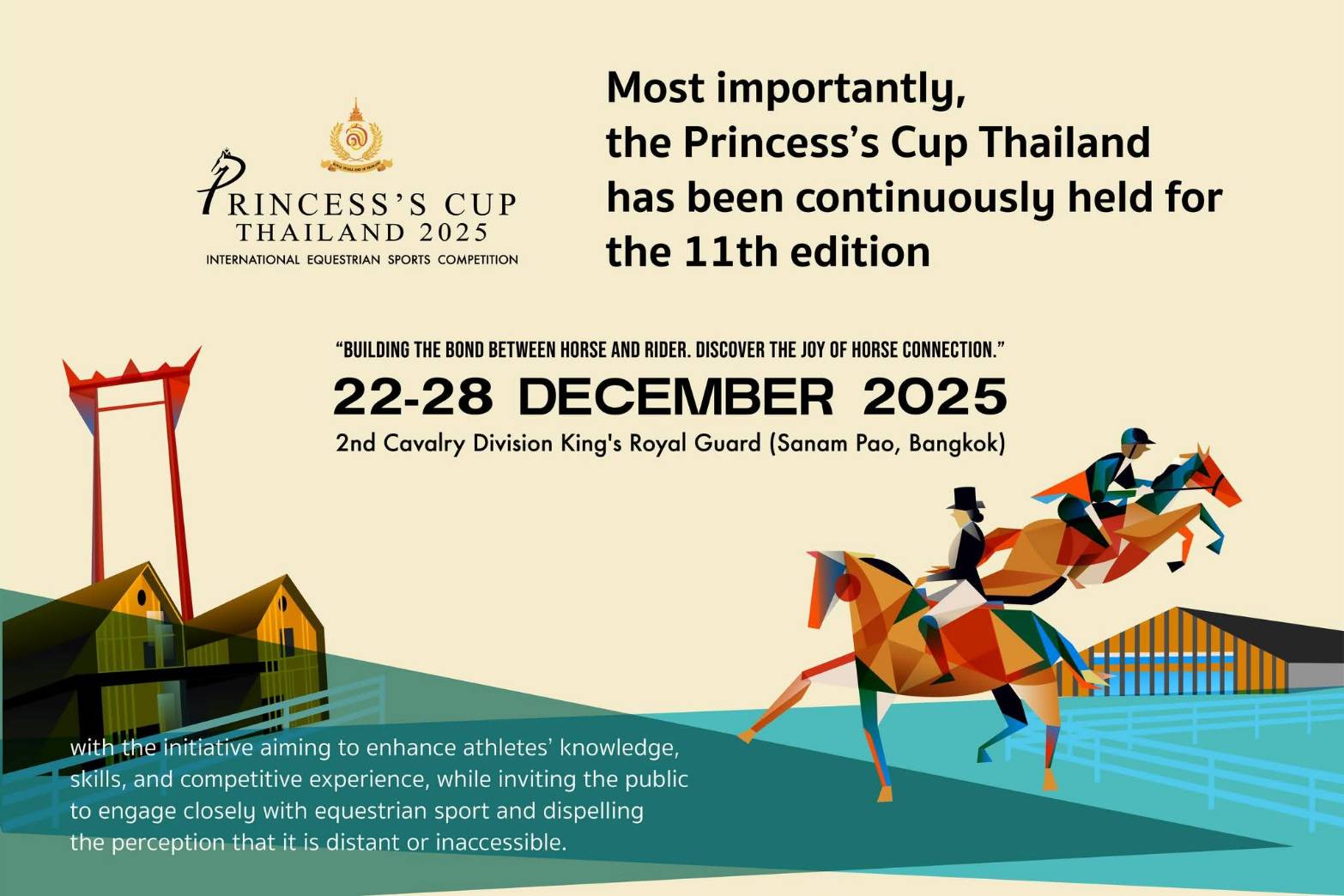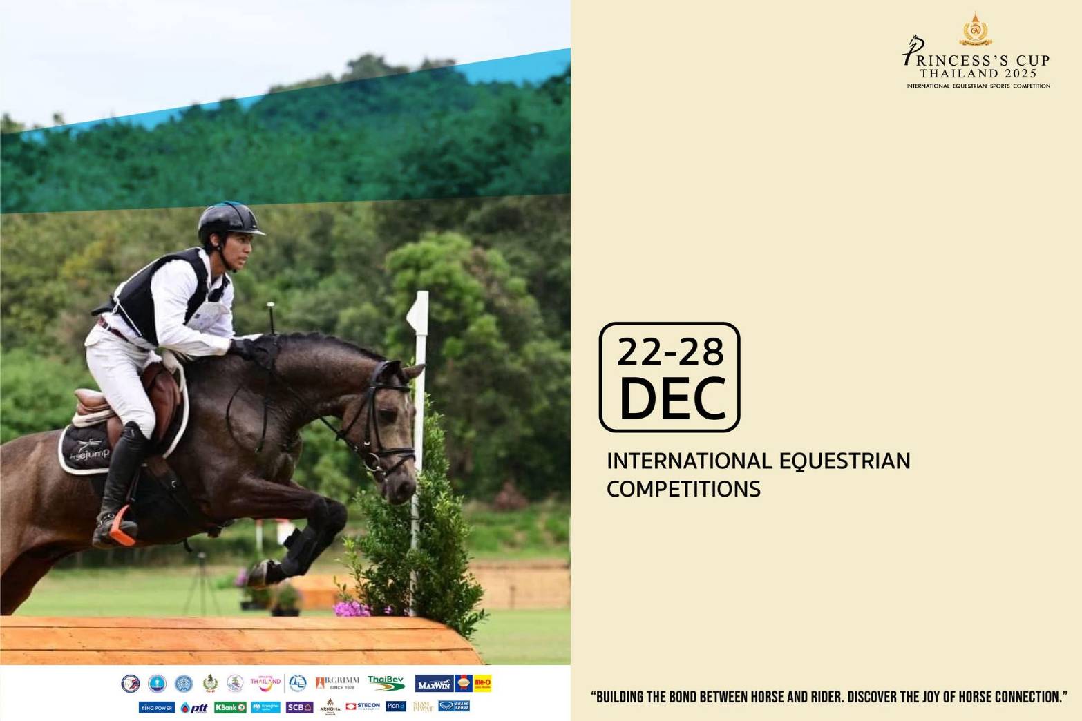 The Princess’s Cup Thailand 2025, scheduled for 22-28 December, is organized under the theme “Building the Bond Between Horse & Rider. Discover the Joy of Horse Connection” at the Royal Stable Unit, Royal Thai Army 2nd Cavalry Division, King's Guard, Sanam Pao, Phahonyothin Road in Bangkok. Members of the public are invited to experience the profound horse-rider relationship in equestrian sports and learn about the inspiration and vision of Her Royal Highness Princess Sirivannavari Nariratana Rajakanya, who plays an important role in driving Thailand’s equestrian sports internationally.