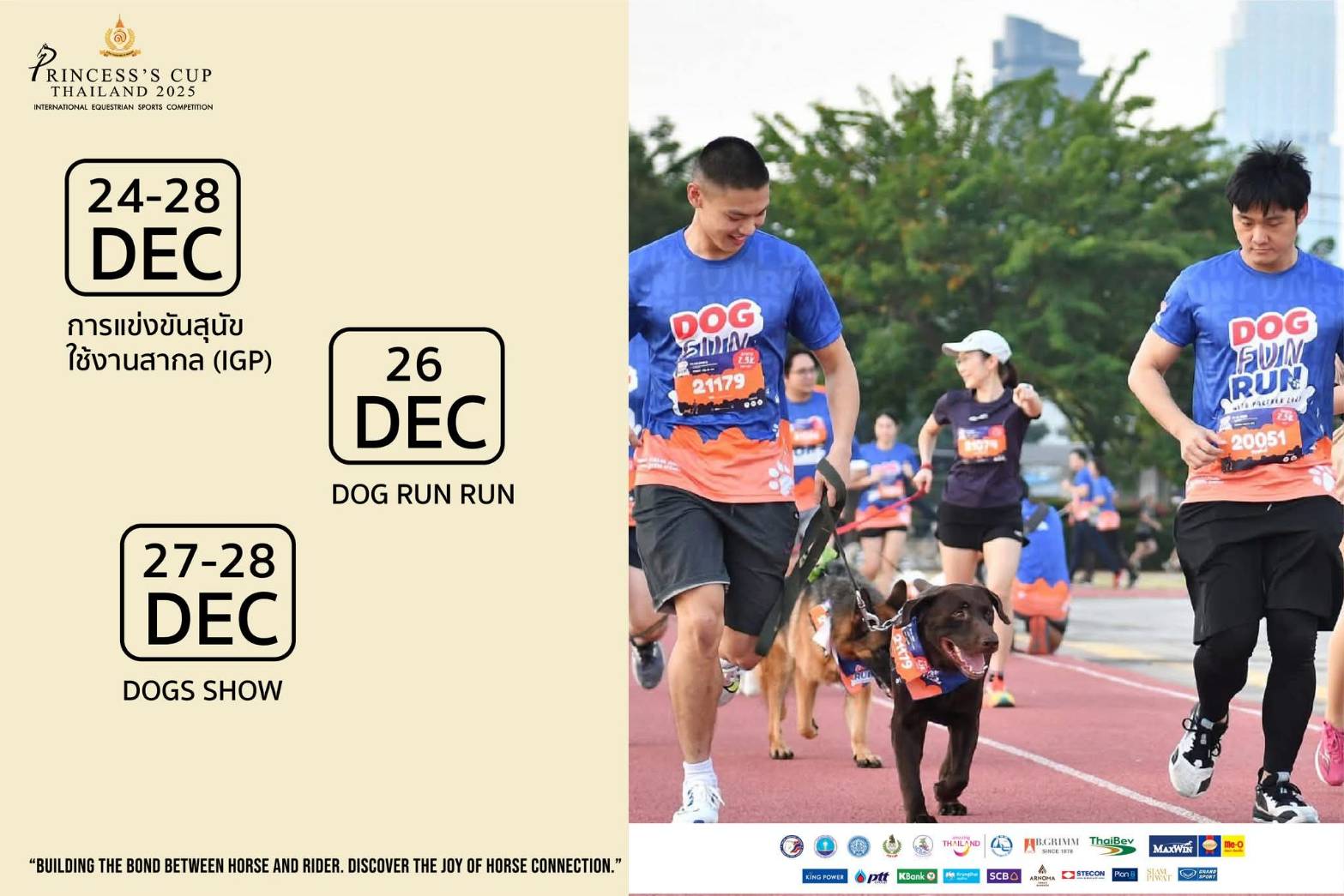 Most importantly, the equestrian event “Princess’s Cup Thailand” has been organized on a continual basis. The Princess’s Cup Thailand 2025 is the 11th of its kind, and it is intended to develop horse-riding skills and experience in equestrian competitions for equestrian athletes. Interested persons may attend this event to learn more about horse riding, and they would probably change their belief that equestrian sports have little to do with them and are difficult or inaccessible. The event features many edutainment activities, such as a Dog Fun Run program, dog contests, exhibitions, and a vibrant flea market, with open spaces for social gatherings and new experiences.