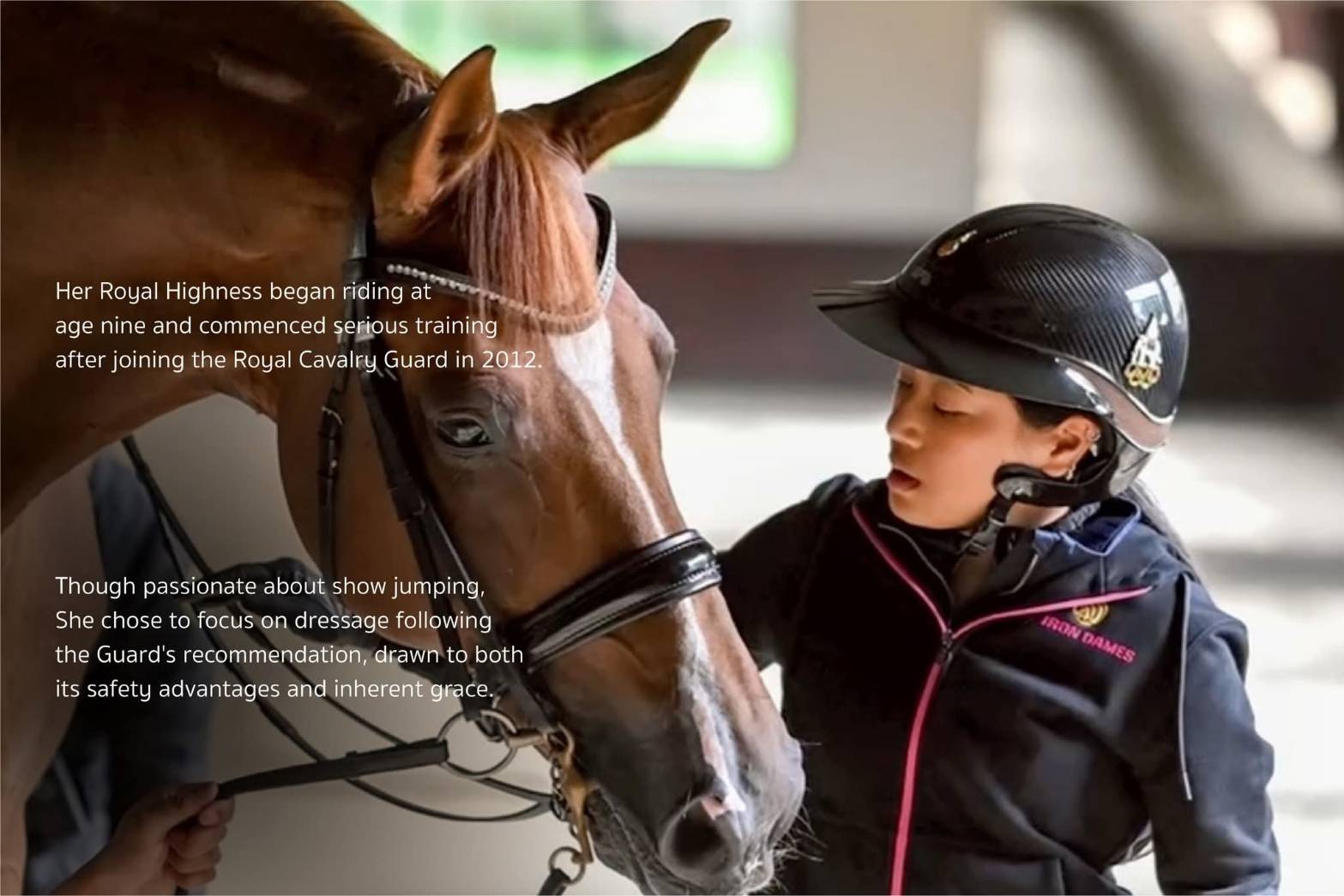 Her Royal Highness Princess Sirivannavari began horse riding at the age of nine and became serious about horse riding after training at the Royal Stable Unit in 2012. Although Her Royal Highness loves jumping, she decided to emphasize dressage, as suggested by the Royal Stable Unit, which cited safety and the sport’s charm and elegance as reasons. The Princess paid great attention to training and has set her intention to go as high in the event as possible, which means attaining the Grand Prix and Grand Prix Special.
