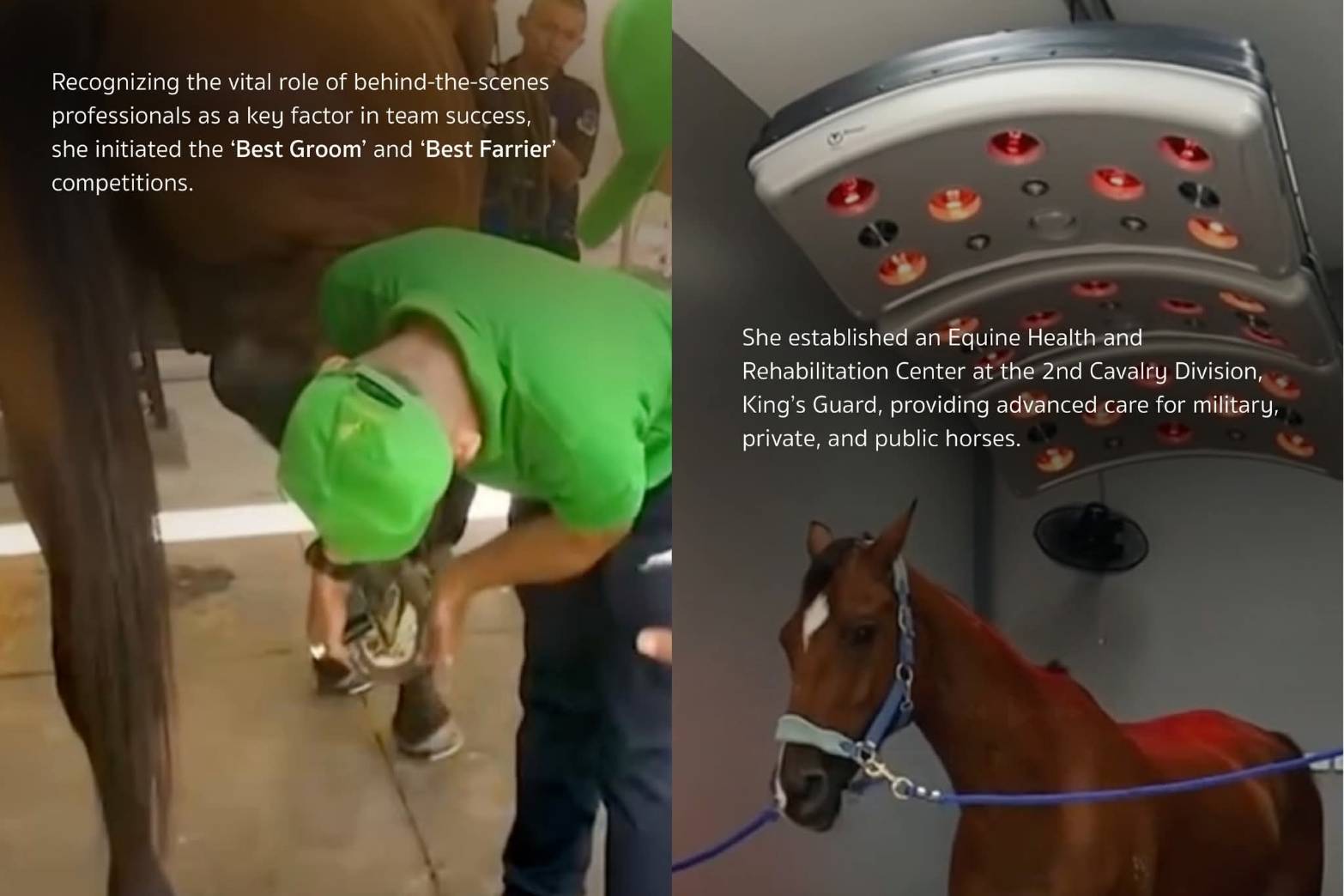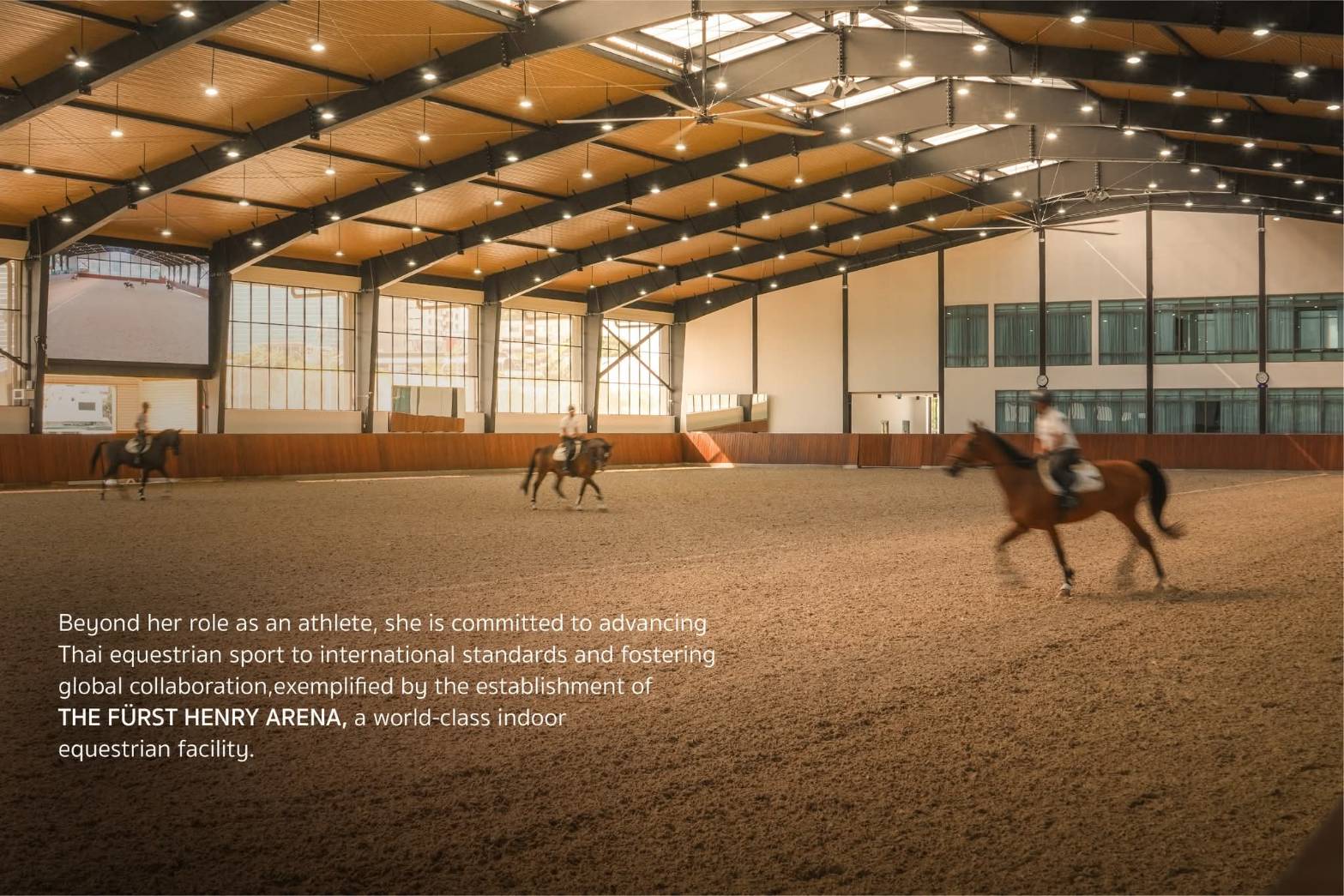 Apart from her role as an equestrian athlete, Her Royal Highness is determined to develop Thailand’s equestrian sports to international standards and enhance cooperation with relevant international organizations. The establishment of the Fürst Henry Arena in Bangkok as a standard indoor equestrian arena was intended to accommodate competitions and provide facilitation for interested persons. Her Royal Highness emphasizes not only the development of expertise for athletes but also the importance of personnel behind the scenes, who are key factors in the success of the team. Her Royal Highness initiated Best Groom and Best Farrier contests in the Princess's Cup Thailand in order to cover the care of horses on a full-cycle basis. The Princess also established the Royal Stable Unit Equine Medical and Rehabilitation Service Center, located in the area of the Royal Thai Army 2nd Cavalry Division, King's Guard. The center aims to elevate the treatment, rehabilitation, and care for horses owned by military units, the private sector, and the general public.