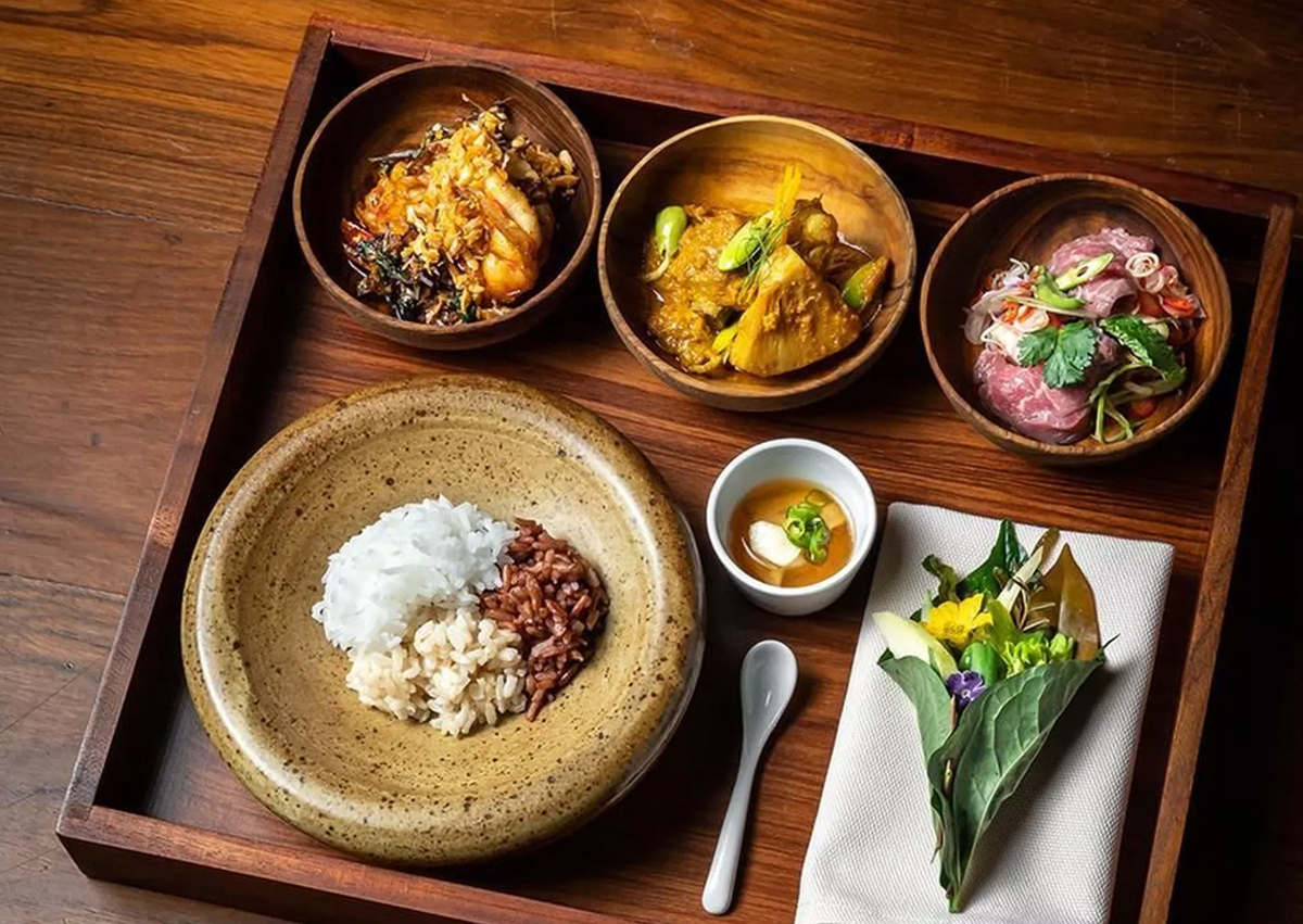 Chef Chudaree Debhakam redefines farm-to-table dining with a seven-course Thai tasting menu that begins in the garden, where guests explore seasonal herbs grown on-site. The menu celebrates Thai ingredients with creativity and sustainability, reducing waste and supporting local farmers.
