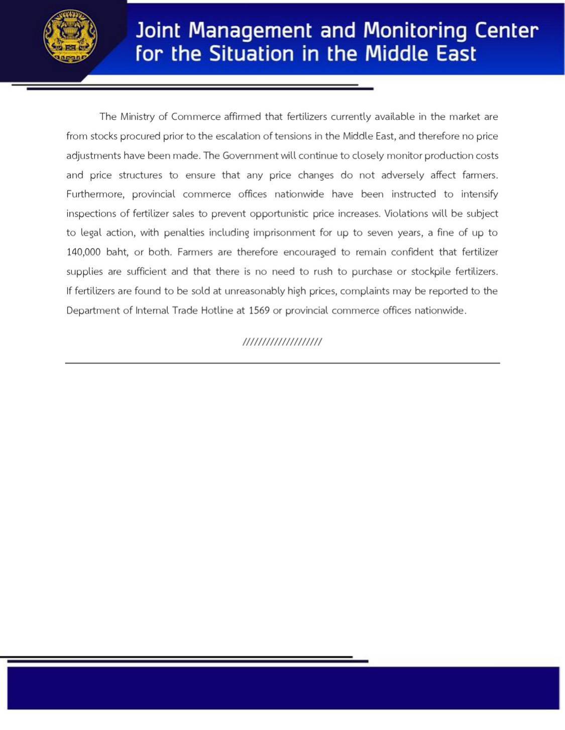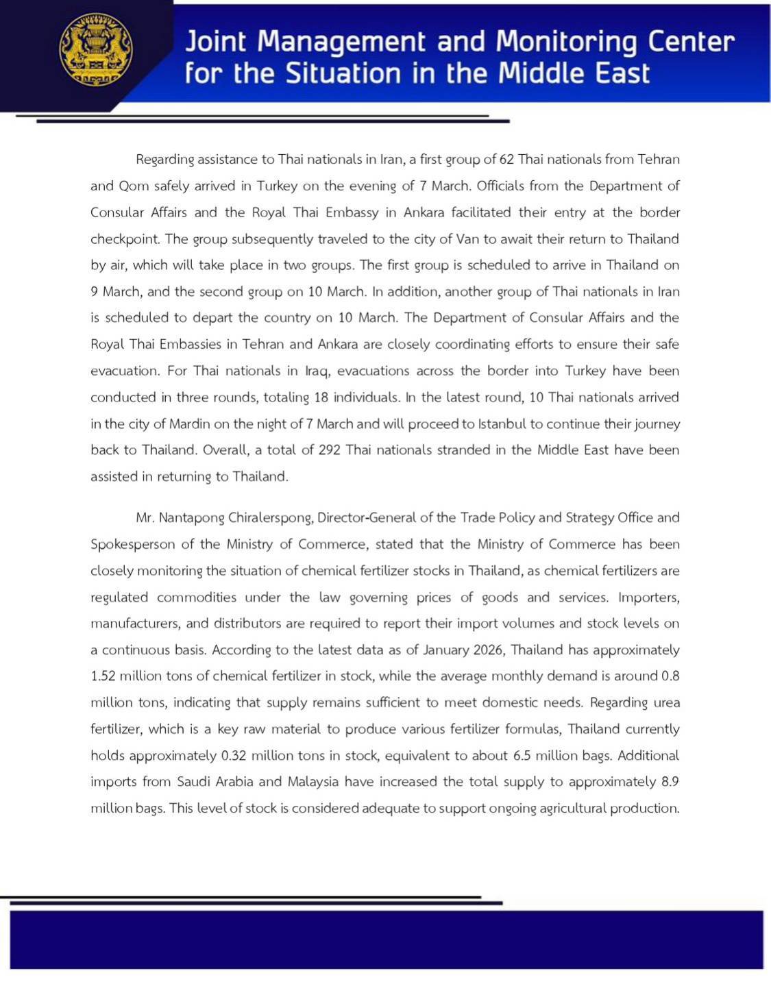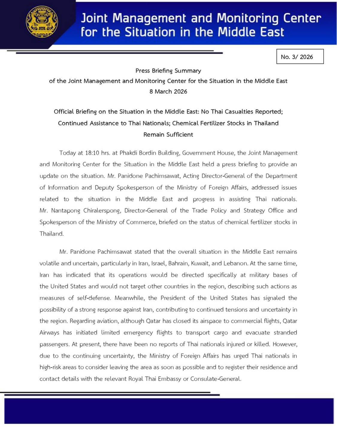 Today at 18:10 hrs. at Phakdi Bordin Building, Government House, the Joint Management and Monitoring Center for the Situation in the Middle East held a press briefing to provide an update on the situation. Mr. Panidone Pachimsawat, Acting Director-General of the Department of Information and Deputy Spokesperson of the Ministry of Foreign Affairs, addressed issues related to the situation in the Middle East and progress in assisting Thai nationals. Mr. Nantapong Chiralerspong, Director-General of the Trade Policy and Strategy Office and Spokesperson of the Ministry of Commerce, briefed on the status of chemical fertilizer stocks in Thailand.